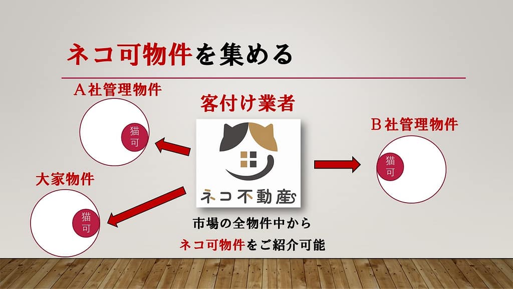 これが「ネコ可物件専門店」の仕組みとなります。A社の管理物件はA社に問い合わせて内見の予約、B社の管理物件はB社に問い合わせて内見の予約が必要になる場合があります。そんな時にネコ不動産にご相談いただければ、一括して内見やご契約のお手続きをさせていただきます。