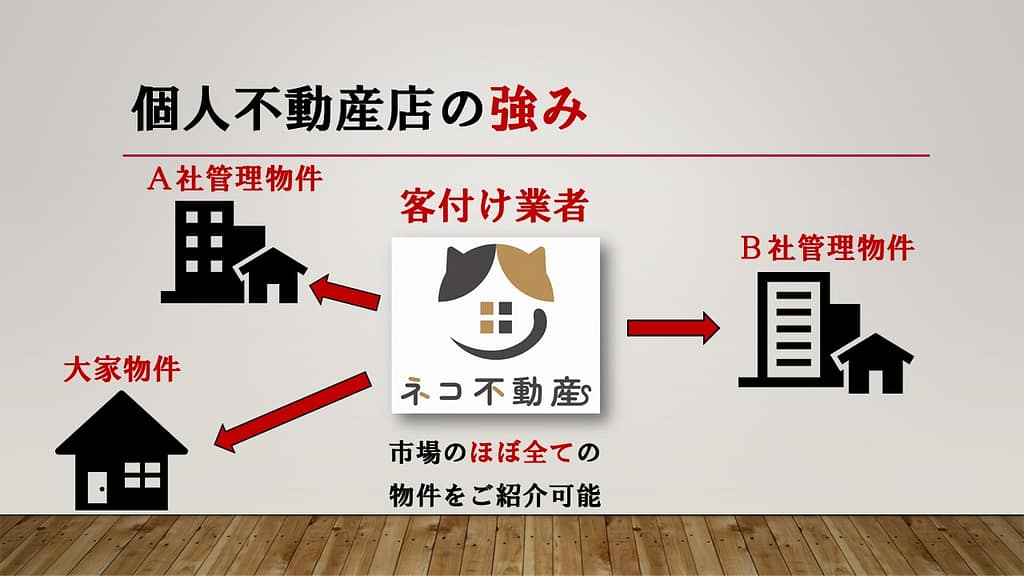 しかし本来は、不動産仲介業者は市場にあるほぼ全ての物件をご紹介可能です。もちろん、ネコ不動産も入居者を募集をしているほぼ全ての賃貸物件をご紹介可能です。利益率が低いのであまり取り組む会社さんはいませんが、上司がいない個人不動産店の強みとしてこのような物件も忖度なしにご紹介できます。