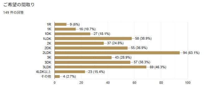 次に希望される間取については2LDKが最も高く全体の63.1%で次いで3LDKが46.3%という回答を得ている(図9参照)。*複数回答可のため、合計すると100%以上となる。売買希望者の回答も含まれる。