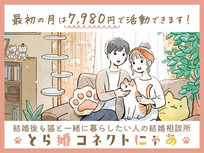 オンライン完結型なので来店は不要。月々7,980円からリーズナブルに婚活を始められます。猫ちゃんとの暮らしも結婚も諦めたくない猫好きさんは、ぜひお気軽にご相談ください!